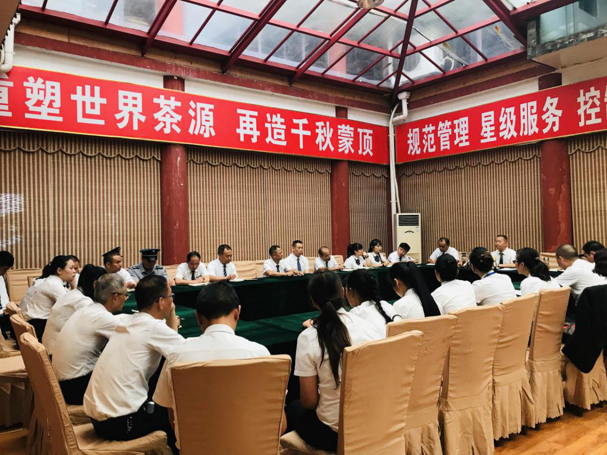 2019年9月10日下午,蒙頂山旅游公司總經(jīng)理衛(wèi)建勇在茶源堂主持召開主管及以上人員參加的8月份經(jīng)營情況分析會。會上傳達(dá)學(xué)習(xí)《四川省文化和旅游廳關(guān)于2019年全省A級景區(qū)復(fù)核檢查結(jié)果的通報》。各中心主任匯報了8月工作中存在的問題及下一步的措施,總經(jīng)理衛(wèi)建勇對各部門工作總結(jié)進(jìn)行點(diǎn)評并對8月份經(jīng)營管理、安全工作情況進(jìn)行了分析總結(jié)。安排部署了“中秋小長假”“國慶黃金周” 景區(qū)接待服務(wù)和安全保障工作。