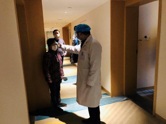 社區(qū)防疫人員對酒店住宿客人進(jìn)行體溫檢