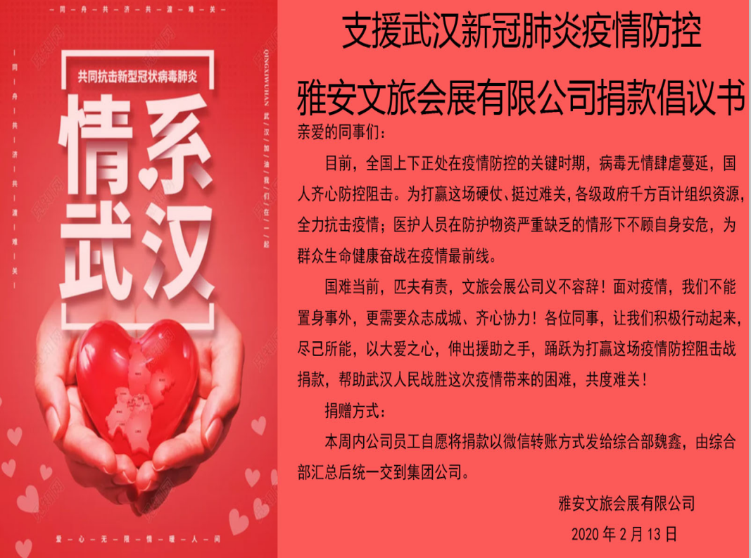 文旅會展公司黨員干部講政治勇?lián)?、迎嚴寒?zhàn)風雪,義無反顧抗擊疫情最前沿,號召公司全體員工獻愛心支援武漢新冠肺炎疫情防控,募集愛心款4200元;帶動項目現(xiàn)場