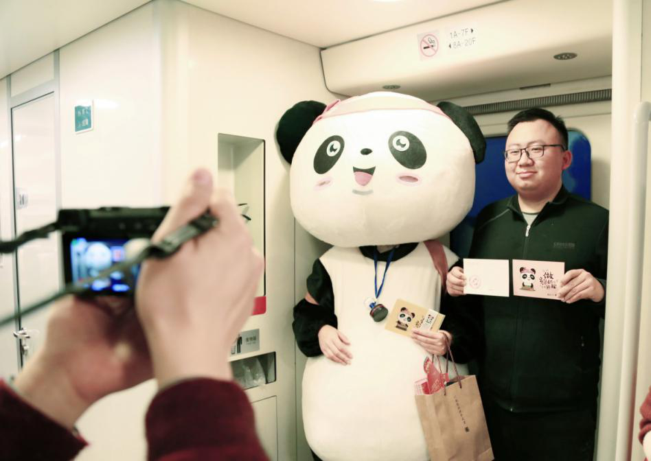 二是制作燈會主題明信片。提前定制雅安城市吉祥物大熊貓雅雅、安安大型人偶,走進車廂向乘客發(fā)出燈會邀請函,首次推出本屆燈會的周邊文創(chuàng)產(chǎn)品800張,暨主題明信片“坐動車回雅安”和“不會做貢茶的滾滾不是真熊貓”,加蓋燈會專屬紀念章,宣傳本屆燈會舉辦時間、地點和亮點,與乘客互動分享1000余人次。