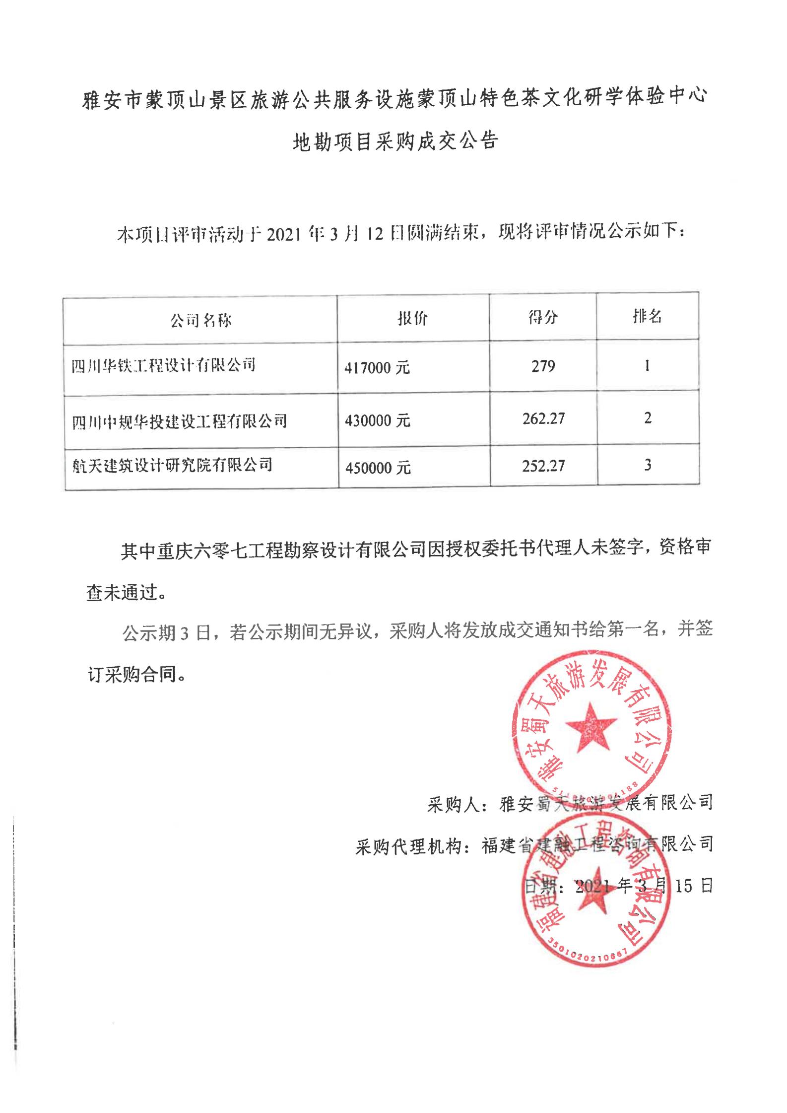 雅安市蒙頂山景區(qū)旅游公共服務(wù)設(shè)施蒙頂山特色茶文化研學(xué)體驗中心地勘項目采購成交公告