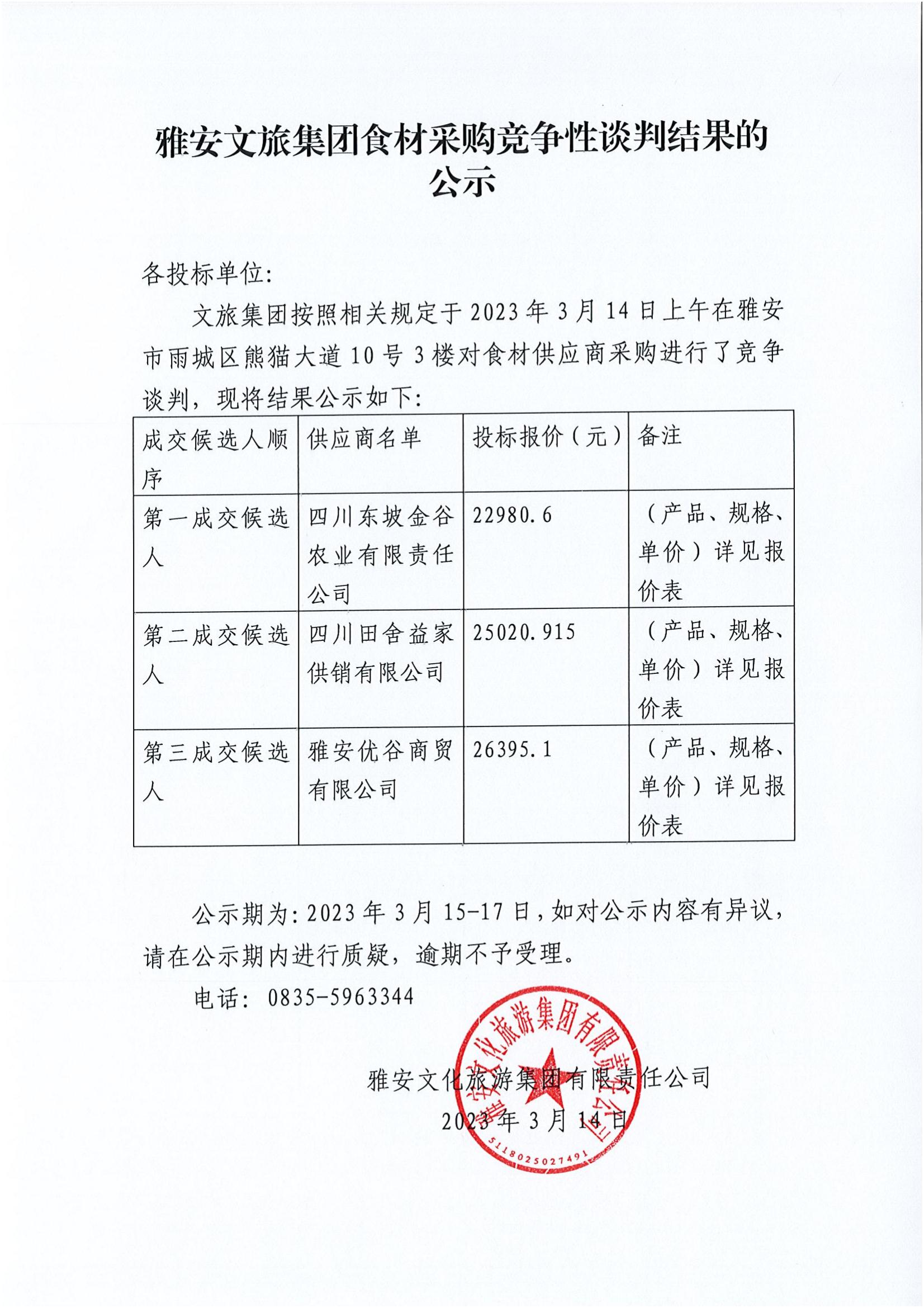 雅安文旅集團(tuán)食材采購(gòu)競(jìng)爭(zhēng)性談判結(jié)果的公示