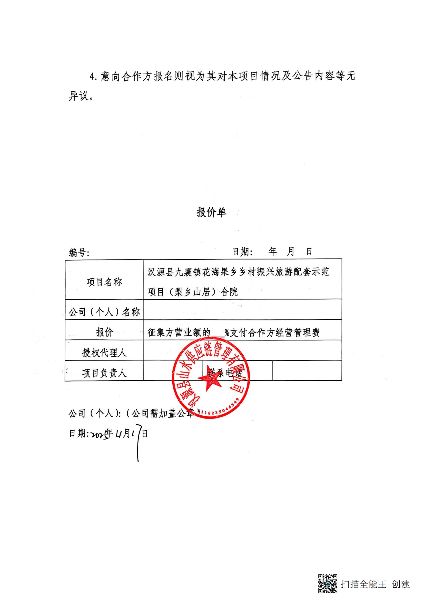 漢源縣山水供應鏈管理有限公司關于公開征集漢源縣九襄鎮(zhèn)花海果鄉(xiāng)鄉(xiāng)村振興旅游配套示范項目(梨鄉(xiāng)山居)合院精品民宿運營管理(含前期裝修設計方案)合作單位 的公告